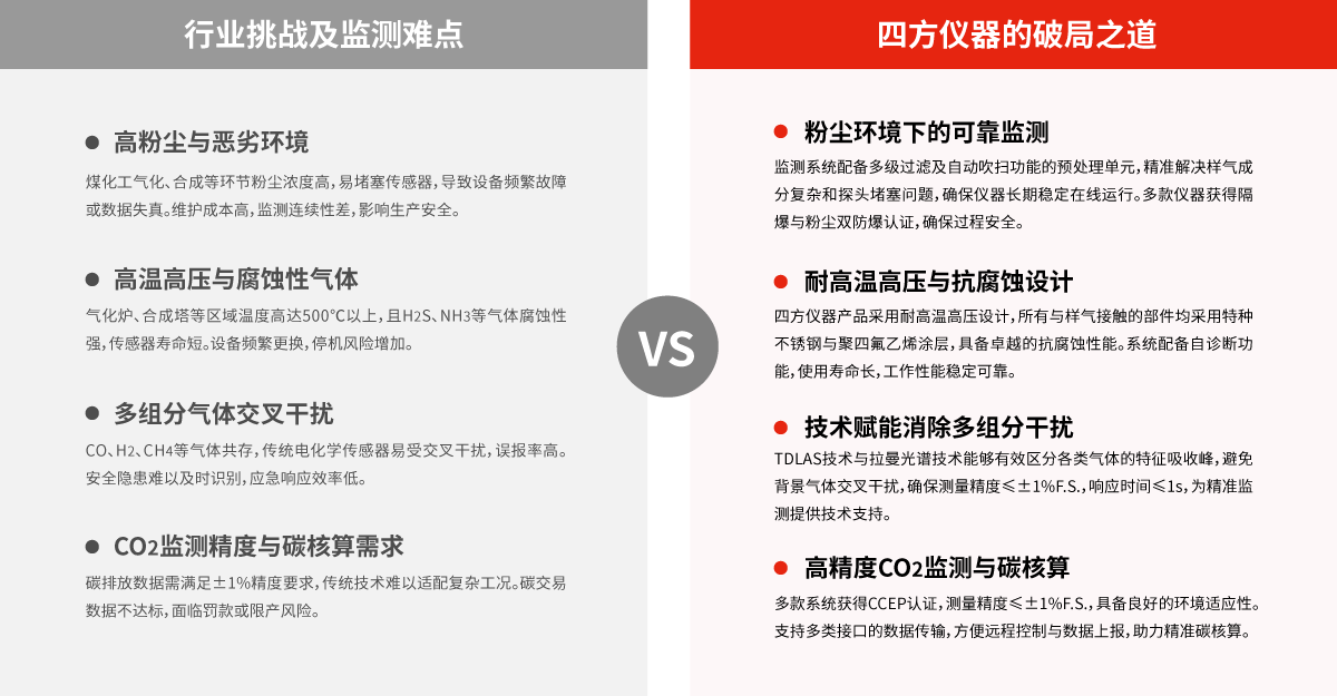 針對煤化工企業(yè)高粉塵、高腐蝕、多組分氣體監(jiān)測的復雜需求,四方儀器深度融合行業(yè)工藝特性與政策合規(guī)要求,提供從原料氣化到合成反應的全流程監(jiān)測解決方案,精準覆蓋多類重點氣體監(jiān)測需求,助力企業(yè)實現(xiàn)安全生產(chǎn)、節(jié)能降碳與長效發(fā)展。