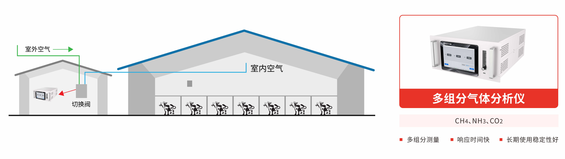 在線氣體分析儀可集成于位于畜舍外固定式監(jiān)測站房內(nèi)部,分析儀設置場外(環(huán)境空氣)和場內(nèi)(畜舍內(nèi)部)兩個獨立進樣口,通過三通電磁閥自動實現(xiàn)氣源切換,在線測量場內(nèi)和場外CH4、CO2,NH3等濃度,實時掌握養(yǎng)殖場環(huán)境信息,保障畜禽健康生長,同時為溫室氣體排放量核算提供準備的數(shù)據(jù)支撐。